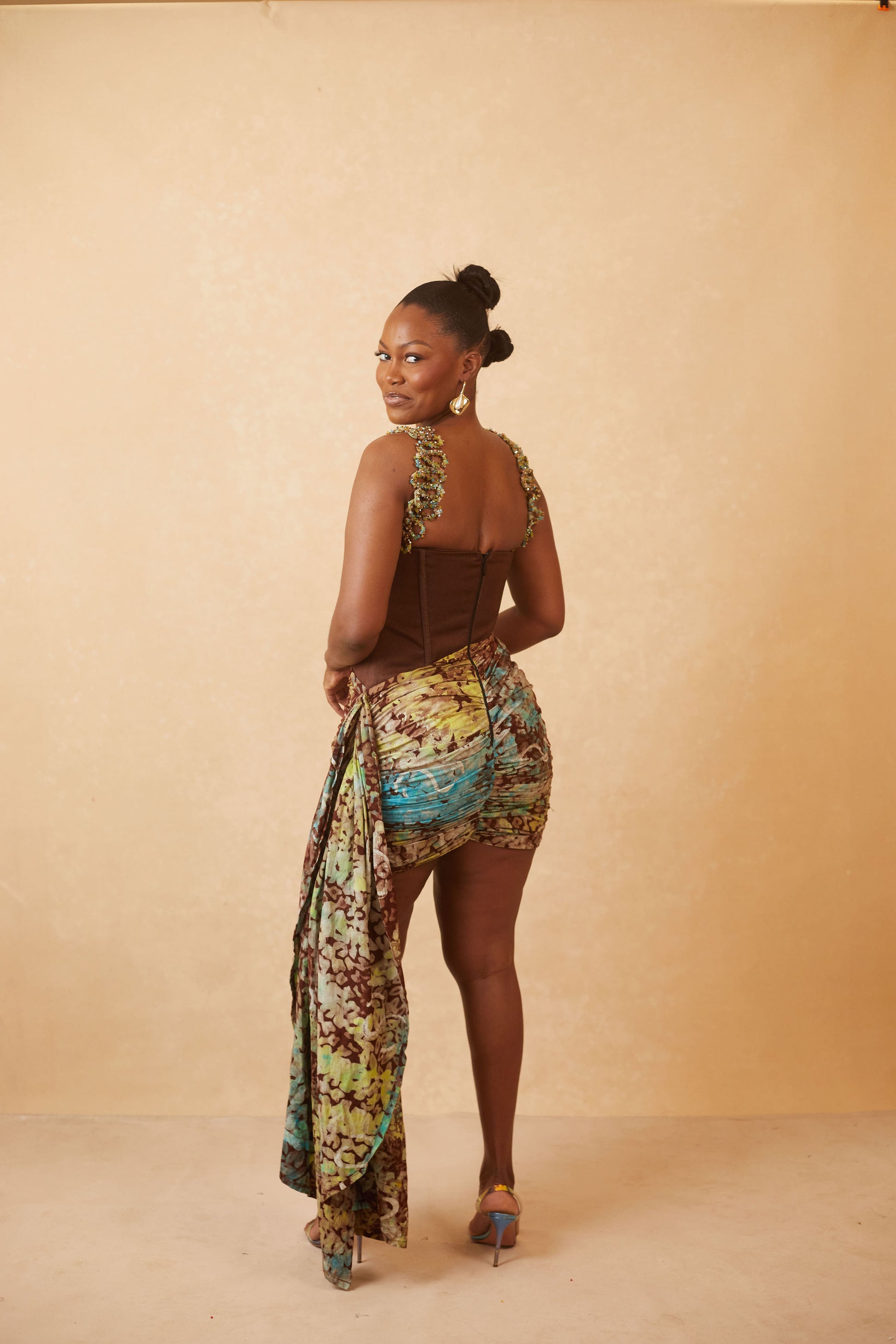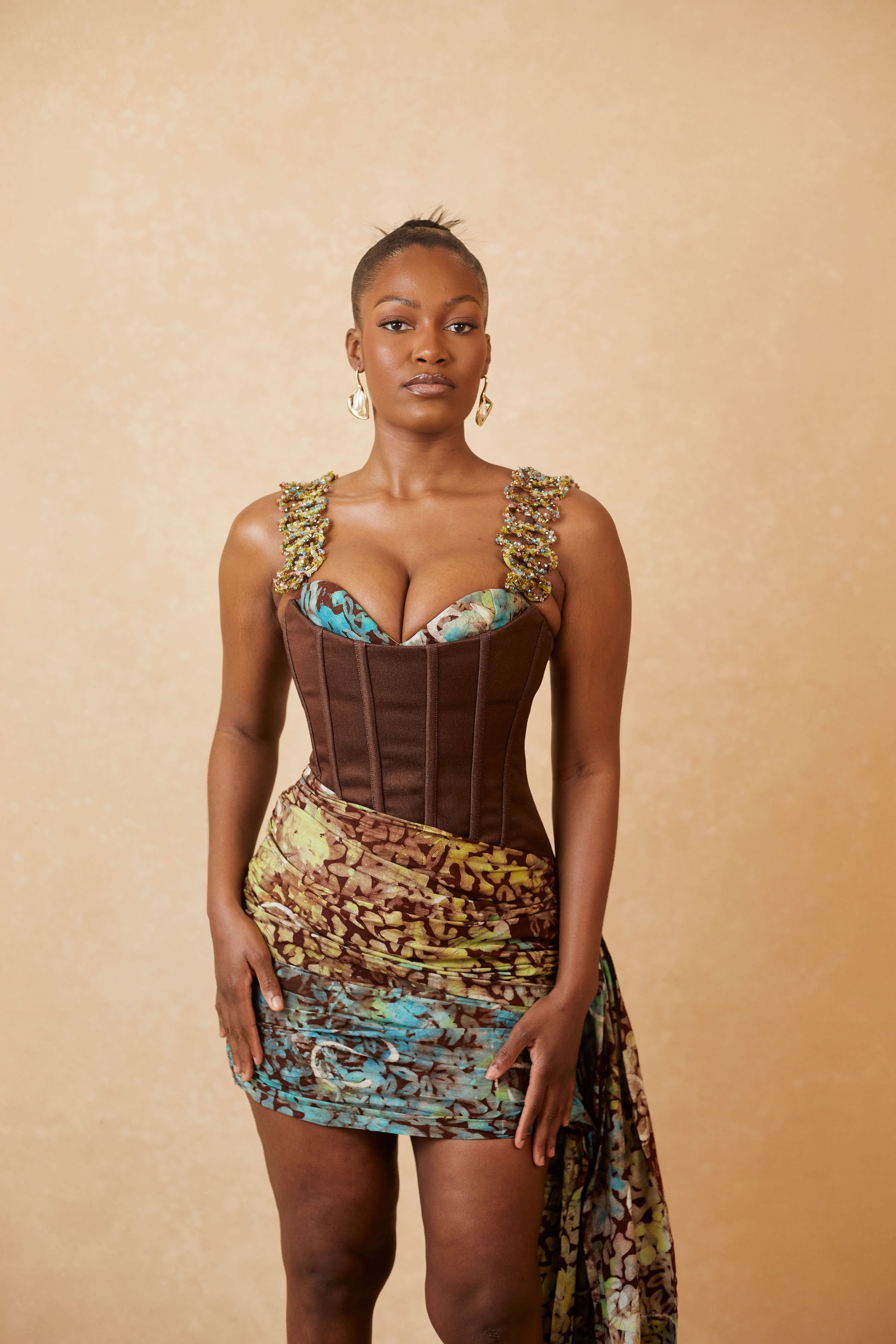 Denim and Tie Dye Corseted Piece with Hand Embellished with Crystal Beads.